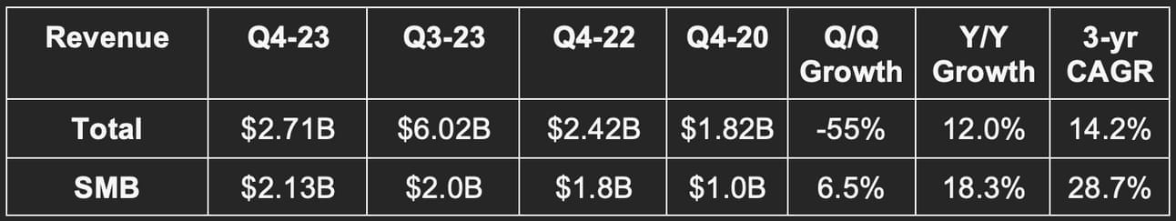While Mailchimp is largely considered a poor acquisition, the company is still LEADING with this offering as its main go-to-market tool as it expands into new geographies. Paid customer growth continues to accelerate while quarterly retention set a 2 year high this quarter. Maybe Alex Chriss (PayPal’s new CEO) wasn’t so silly to want to buy this after all. They did overpay, but the product seems to be plugging in very nicely to the rest of the business. Revenue here rose by a mid-teens percentage Y/Y.