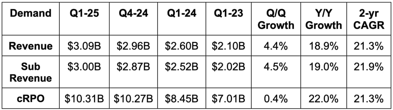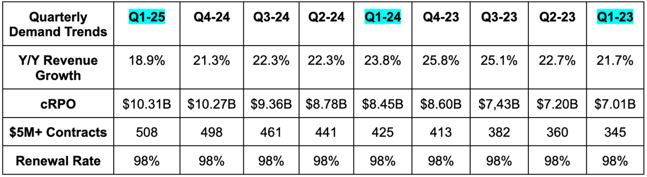 - Beat current remaining performance obligation (cRPO) estimates by 2.1%. Beat 20.5% cRPO FXN growth guidance with 22.0% Y/Y growth.