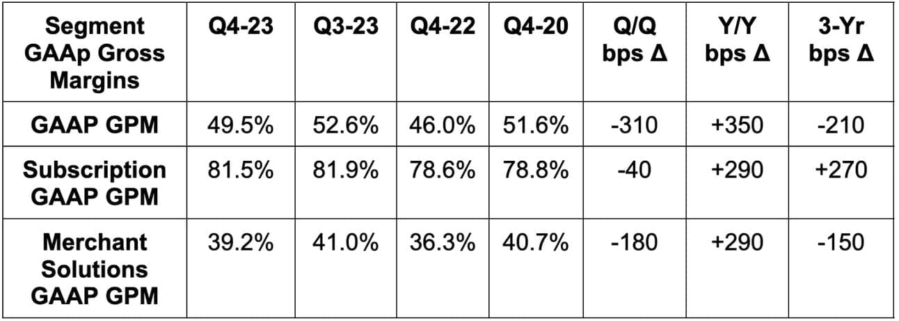 • Shopify slightly missed GAAP gross profit margin (GPM) estimates, but met its GAAP GPM guide.