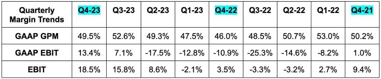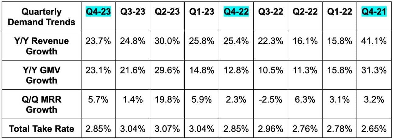 Its low 20% Y/Y revenue growth guide for Q1 compares favorably to expectations of 20.2% Y/Y growth. Its mid-to-high 20% Y/Y revenue growth guide for Q1, when excluding the sale of its fulfillment business, also compares favorably to expectations of about 26% Y/Y growth.