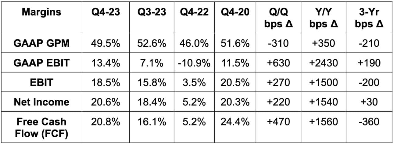 It guided to a 51% GAAP GPM for Q1 vs. expectations of 51.3% and told us to expect 13%-14% Y/Y GAAP OpEx growth. This is GAAP OpEx guidance, while the analyst data I have access to is in non-GAAP. Its implied non-GAAP EBIT guide is a tad light vs. consensus. The reason didn’t bother me. Shopify has identified new marketing opportunities at strong payback periods for Q1 2024 and will accelerate spend to capture that potential. AI is the source of this new opportunity as Shopify has cut acquisition costs by 30% using GenAI models. Its Q1 FCF guidance was roughly in line and its vague full year FCF commentary keeps the annual FCF estimate firmly on the table.