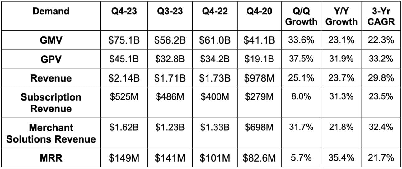 As a reminder, Hydrogen is Shopify’s headless commerce offering. Headless simply means separation of back and front end functions to enhance customization and accelerate store innovation. This offering crossed $1 billion in Q4 GMV, which rose 600% Y/Y off of a very small base. ButcherBox and Tecovas are both now using it, with momentum expected to continue into 2024.