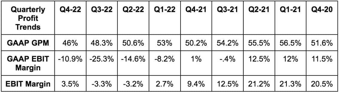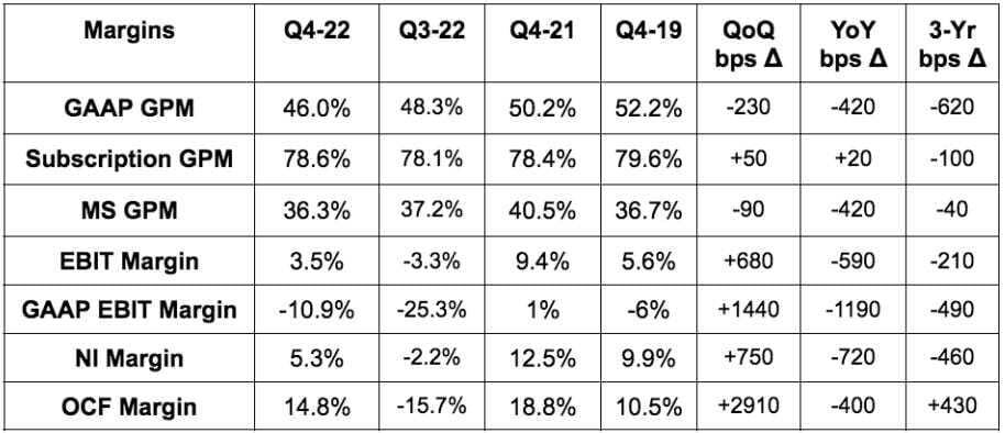 • Missed 46.7% non-GAAP gross profit margin (GPM) estimates by 70 bps.