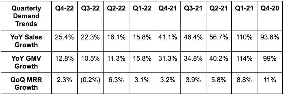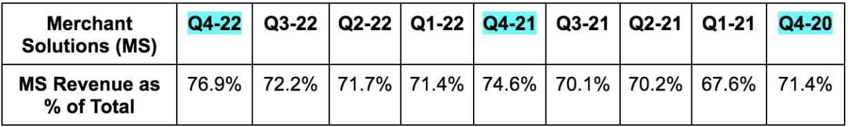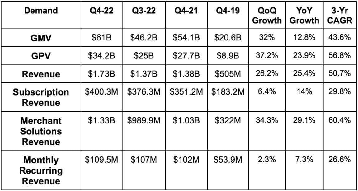 • Merchant solutions revenue is more closely tied to GMV than subscriptions. It’s based on usage of tools like fulfillment & marketing rather than pre-set subscription rates. As a result, the seasonal Q4 GMV boost helps that bucket more than subscriptions.
