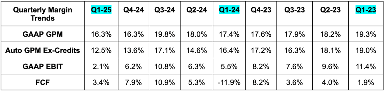 Margin tailwinds for the quarter included regulatory credits, comping over the Cybertruck launch last year and lower input costs per vehicle. Cost efficiency gains continue an encouragingly consistent trend and came from lower raw material costs. Headwinds included lower fixed cost leverage from the Model Y refresh, AI and 22% Y/Y R&D growth. Lower average selling price, which was related to mix shift and more financing offers, also hurt profitability.