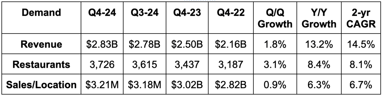 For the full year, 9% store growth and about 3% comparable sales growth guidance for 2025 leave us with about 12% revenue growth guidance for the year. This missed 13.3% growth estimates. If we instead assume “low-to-mid single-digit” growth means 4%, then it only slightly missed estimates.
