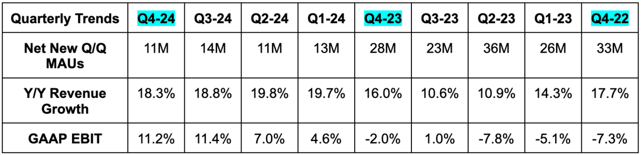- Beat net new monthly active user (MAU) guidance of 25 million by a robust 10 million.