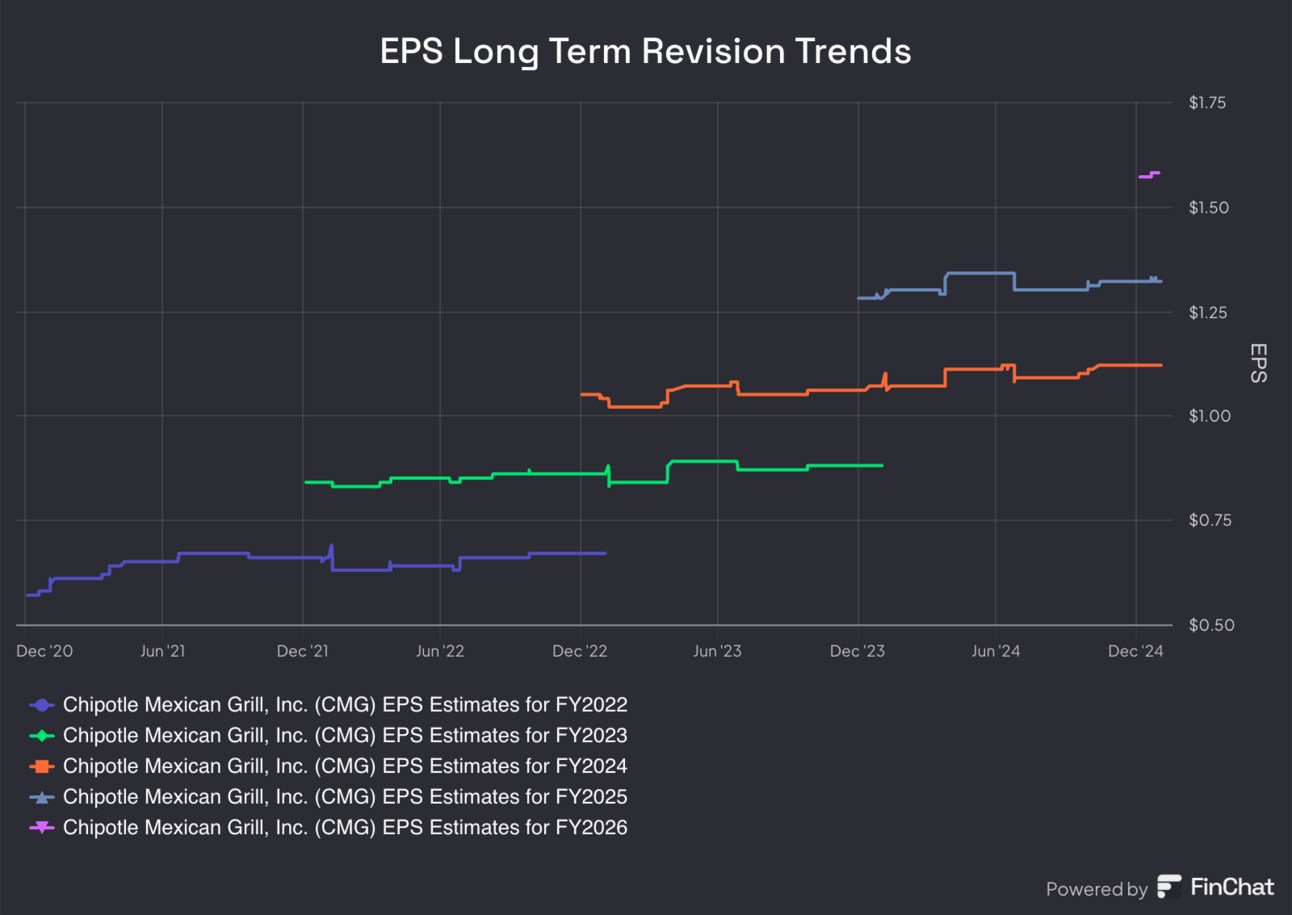 Chipotle trades for 42× 2025 EPS estimates. EPS is expected to compound at a 19% clip for the next two years. Estimate revisions will likely fall a bit after this report.
