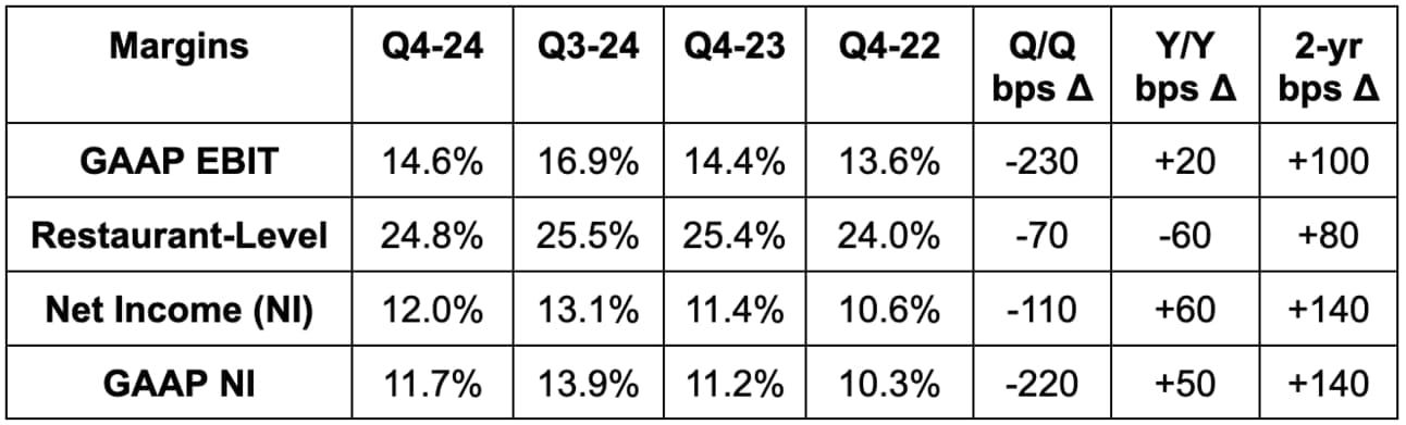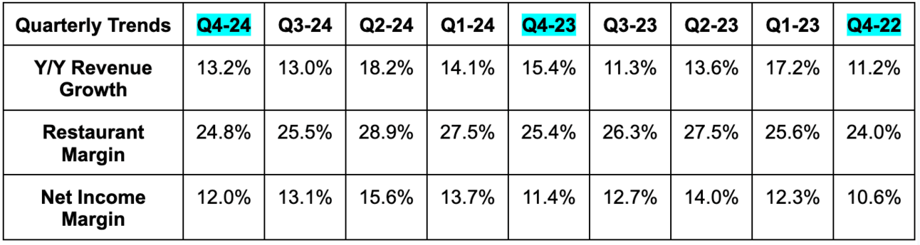 - Beat 24.5% restaurant-level margin estimate by 30 bps.