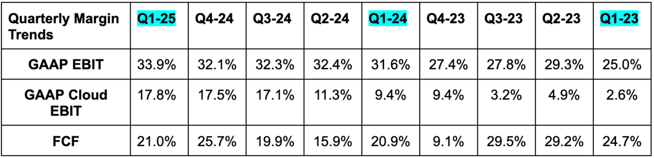 - EBIT rose by 20% Y/Y; OpEx rose by 9% Y/Y; R&D rose by 14% Y/Y – led by ramping depreciation expenses via all of the 2023 and 2024 CapEx growth.