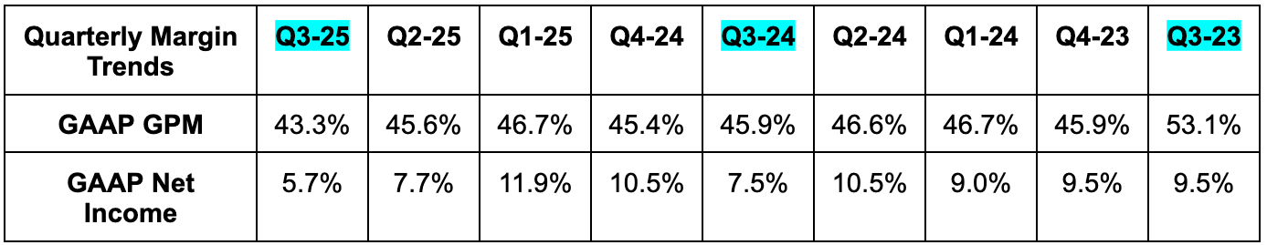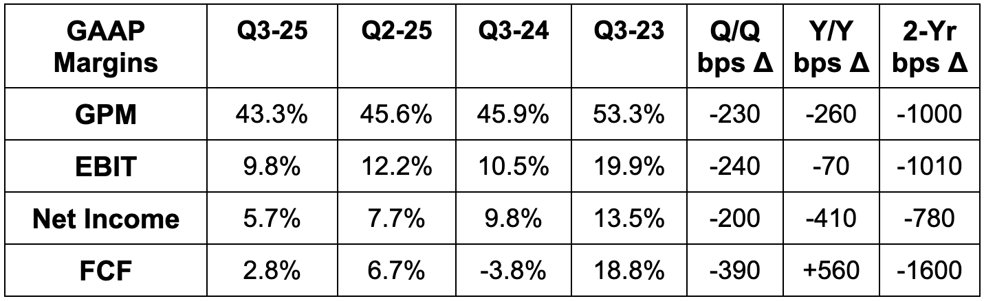 - Missed 45% GPM estimates by 170 basis points (bps; 1 basis point = 0.01%).