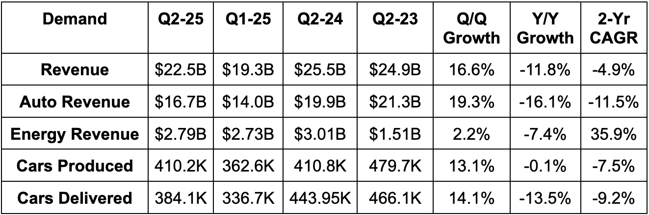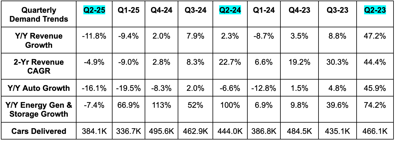 Is this because others suddenly have better cars than Tesla? I don’t think so. The Model Y is fantastic. Is this because Musk has become so polarizing in the world of politics? Maybe. Is this because his focus has perhaps strayed to other things like the America Party, xAI and building diners? Maybe. Whatever it is, the trends you see below must sharply improve in the future for this to keep earning the sky-high multiple it enjoys.