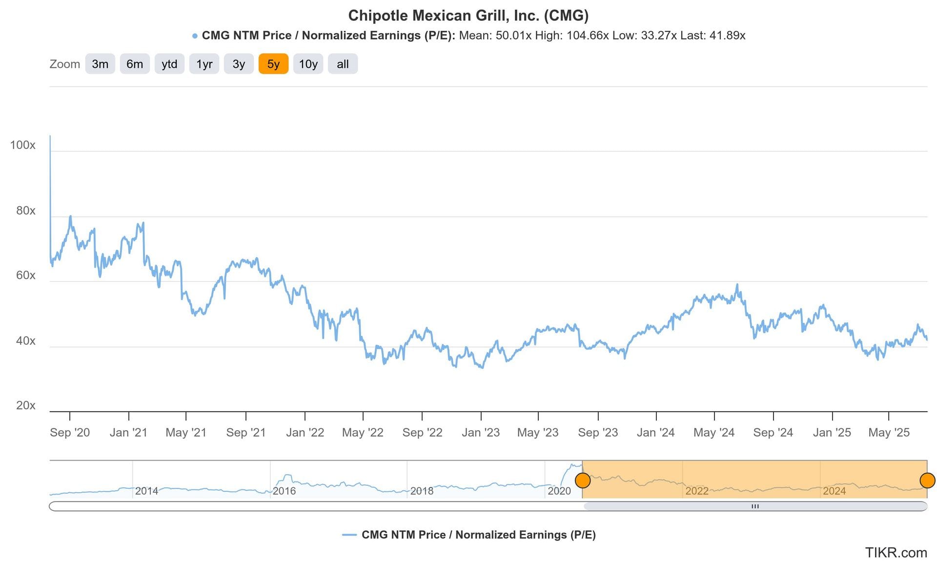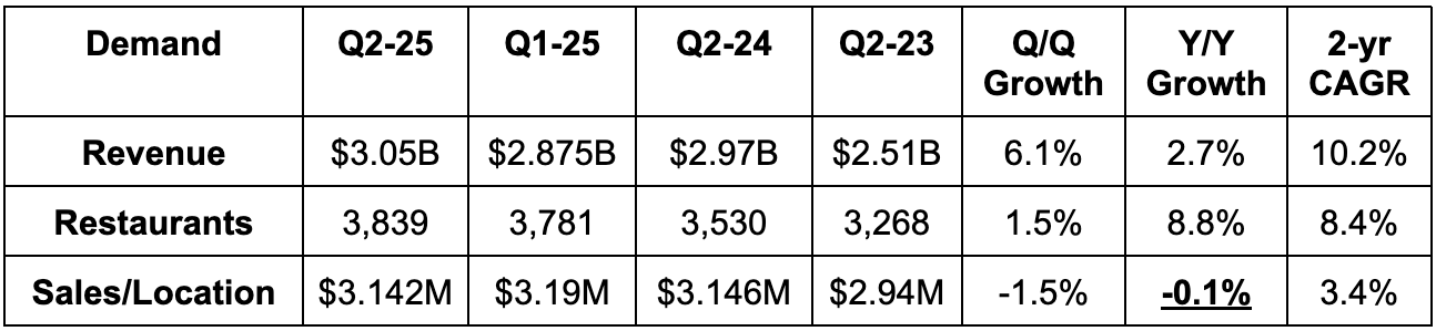 - Chipotle again lowered its comparable restaurant sales growth guidance from low single digits to 0%. It was low-to-mid-single digits entering 2025. Not good.