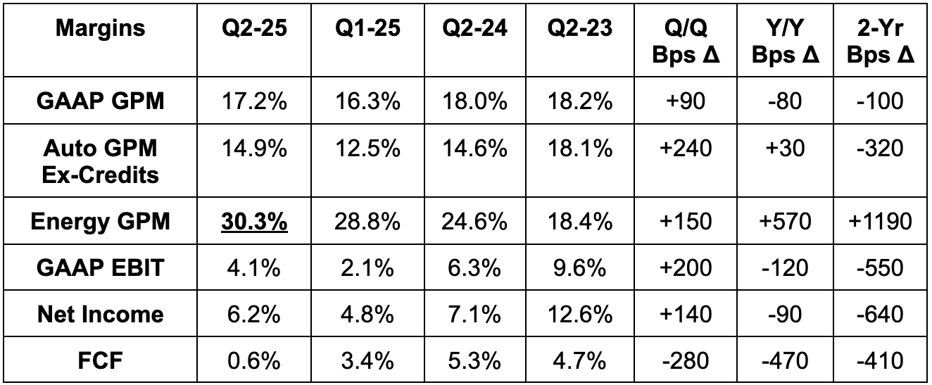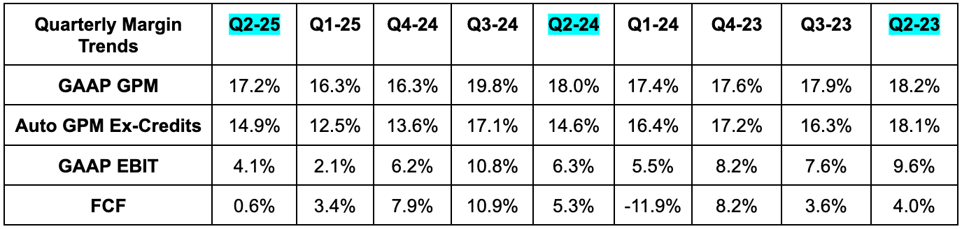 Despite increasingly easy comps and three 2024 rate cuts, Tesla is struggling to find any revenue growth. And we cannot blame that on macro when market share is also declining in all of its markets. Other automakers deal with the same exogenous headwinds, yet competitors like Rivian and Lucid are finding positive revenue growth. While the margin profiles for those companies stink vs. this one, Tesla has been the leader in this space for a long time. Leaders generally don’t deliver back-to-back quarters of negative 2-year revenue growth while their competitors enjoy expansion.