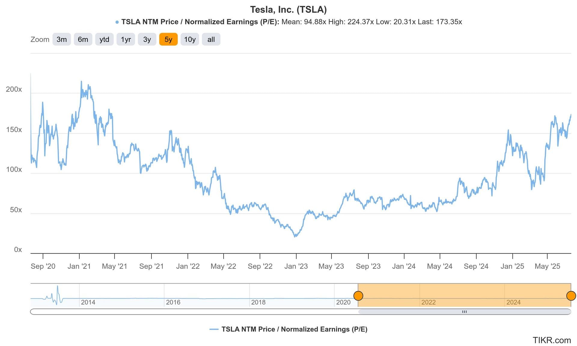 Tesla trades for a whopping 173x forward EPS. EPS is expected to fall by 26% this year and grow by 54% next year.