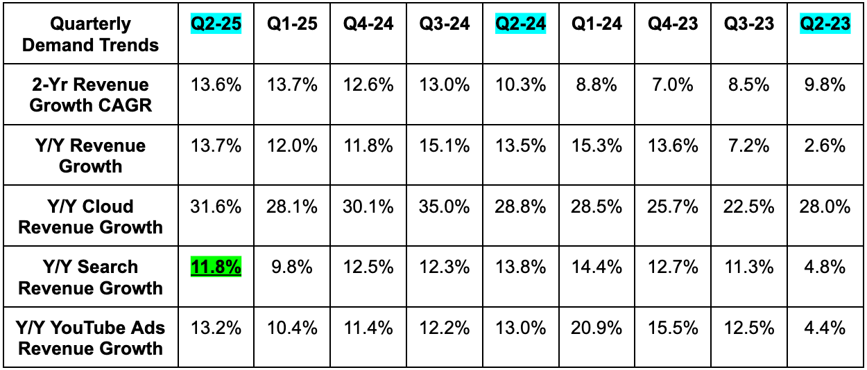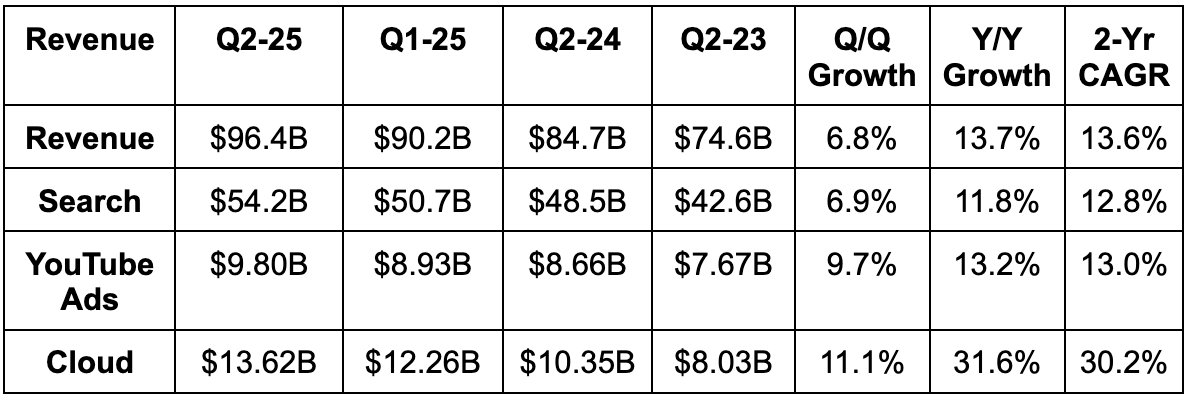 All AI product innovation in search is going well. AI Overviews have 2B MAUs (vs. 1.5B earlier in the quarter) and AI Mode is rapidly expanding. While this is nice, it’s somewhat seamless to grow users for these products when people are already coming to this behemoth for search. And because of that, I’m far more encouraged about the 10% engagement uplift that AI Overviews are delivering. That’s more meaningful for gauging success here and the 10% boost merely grows over time.