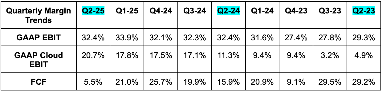 Hefty CapEx over the last several quarters is also now contributing to faster depreciation cost growth. For review, spending CapEx dollars counts immediately against FCF. In this case, those dollars create tangible assets, which have finite useful lives. As we work through these useful lives, the value of the assets are reduced to reflect the aging. That impacts EBIT and net income in the table below. Depreciation rose by 35% Y/Y. A lot of that cost is incurred in the cloud business, which is why it’s so encouraging to see the EBIT margin sharply expand despite this item. The depreciation headwind will not halt the fantastic margin trajectory this is on.