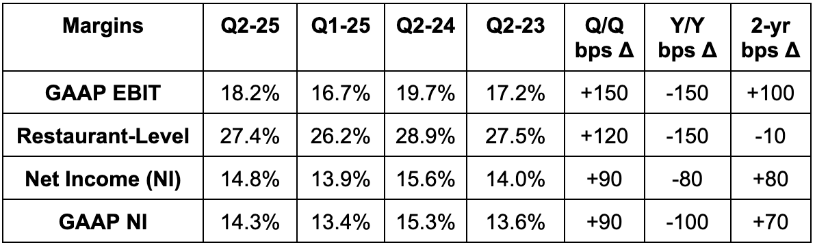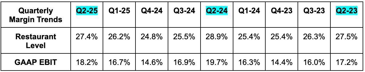 - Beat 27.1% restaurant-level margin estimates by 30 basis points (bps; 1 basis point = 0.01%).
