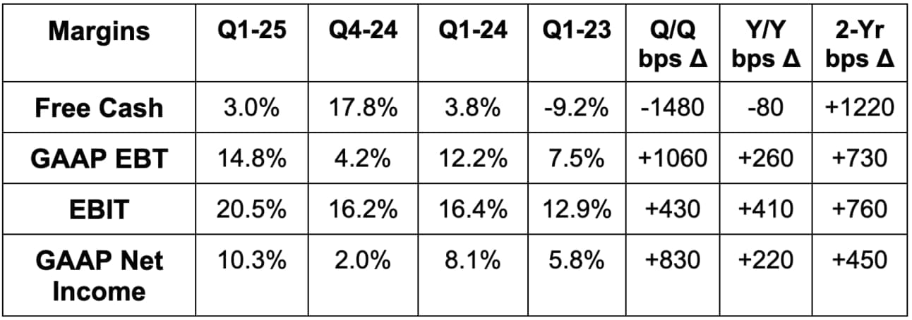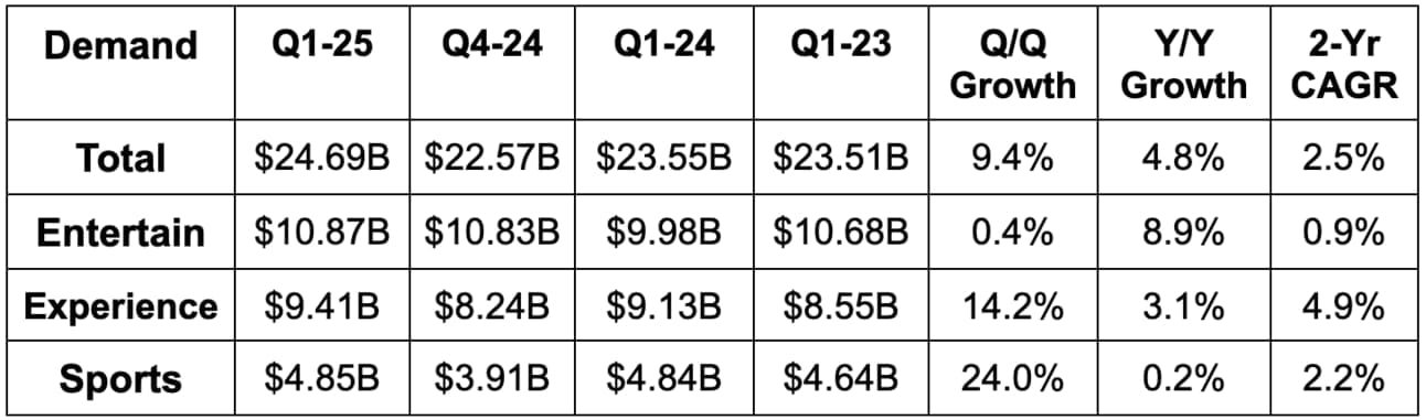 - Beat FCF estimates by 5%. $2.08B in CapEx vs. $815 Y/Y to support experience expansion.