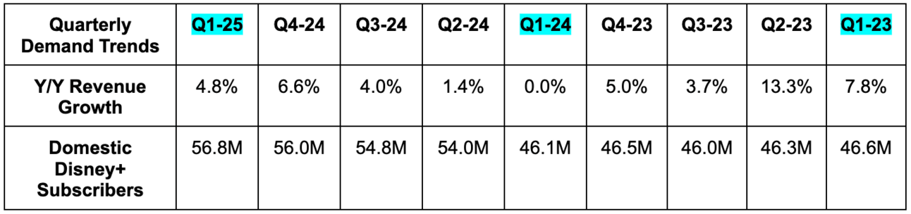 This success is not currently showing up in subscriber growth for Disney+ specifically, as again Disney is still dealing with higher churn related to large recent price hikes across the products. The company expects to grow overall streaming subscribers for the year, and Q1 outperformance increases its overall confidence in doing so.