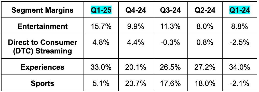 Disney reiterated 2025 guidance. It continues to expect high single-digit EPS growth, 10%+ entertainment EBIT growth, 13% sports EBIT growth and 7% experiences EBIT growth. It also reiterated its $15 billion operating cash flow (OCF) guidance. After the large profit beats, some wanted an annual guidance raise. Here’s what leadership had to say about that: