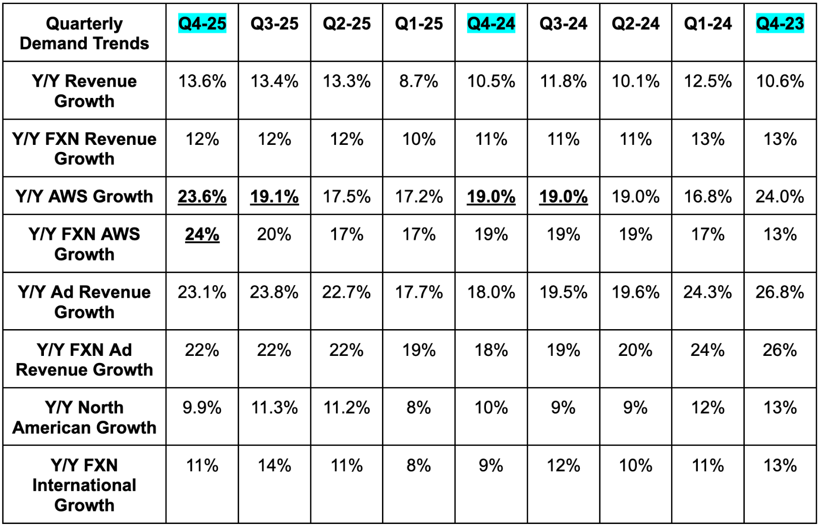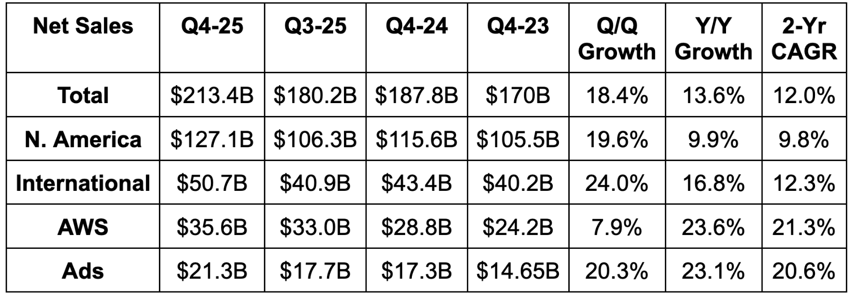 - This was the fastest rate of AWS growth since Q3 2022. Strength was broad-based and acceleration was not aided by abnormally easy comps. At the same time, the Anthropic ramp and a half quarter of OpenAI ramping both helped a lot.