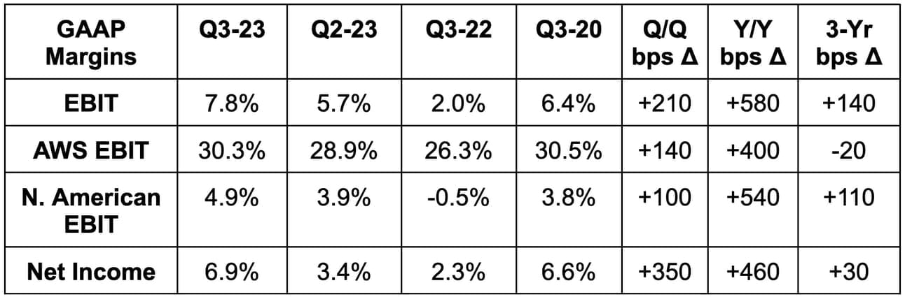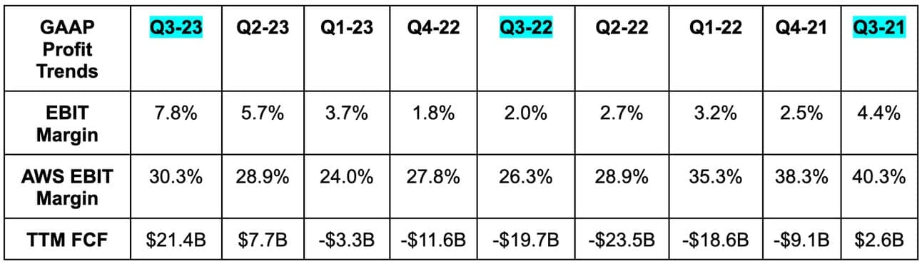 - Rivian mark to market equity gains make GAAP net income very noisy for Amazon. Its stock price directly impacts Amazon’s net income. Free cash flow and EBIT are my preferred metrics here for this reason.