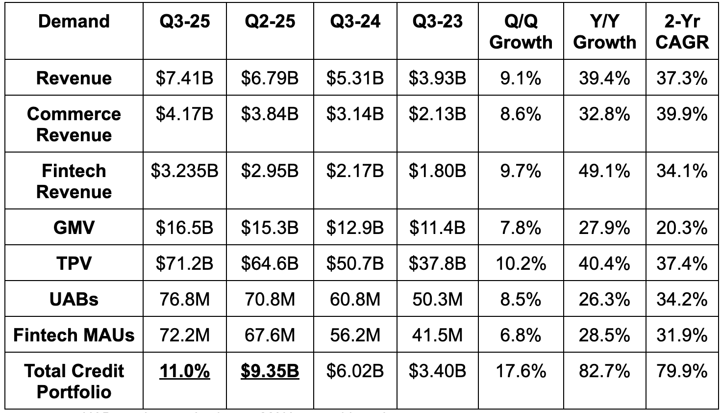 So much to discuss for margins. There were a ton of moving pieces that we covered throughout the quarter and had material impacts. It’s accelerating operating expenses (OpEx) across a few categories to extend its competitive edge and capture what is still a massive future opportunity. Examples include its lowered free shipping minimums in Brazil, which had a full quarter impact for Q3 compared to just a 1 month impact last Q. Other examples are its reduced Brazilian merchant fees, investments to grow 1st-party assortment in categories like grocery, more marketing and higher credit provisions stemming from overall portfolio expansion. That last factor is why FCF missed by such a wide margin. The credit book was nearly $1B larger than expected and originations count towards cash burn. That credit item is easing in terms of Y/Y margin headwind, but was expected to ease a lot more than it did.