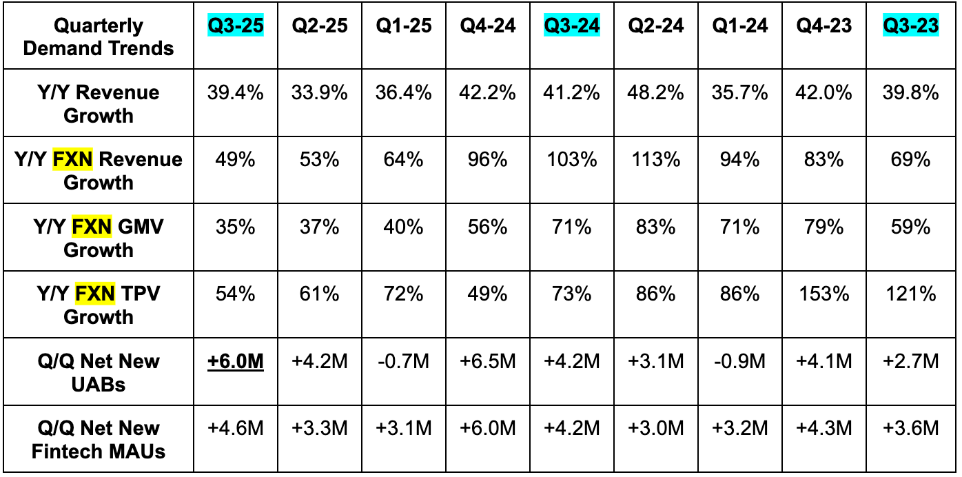 - Brazil is where competition is the most fierce, yet FXN Acquiring TPV grew by 28% Y/Y. Growth has been slowing across the sector while MELI accelerated there. Since they revamped go-to-market in that nation, results have been great.