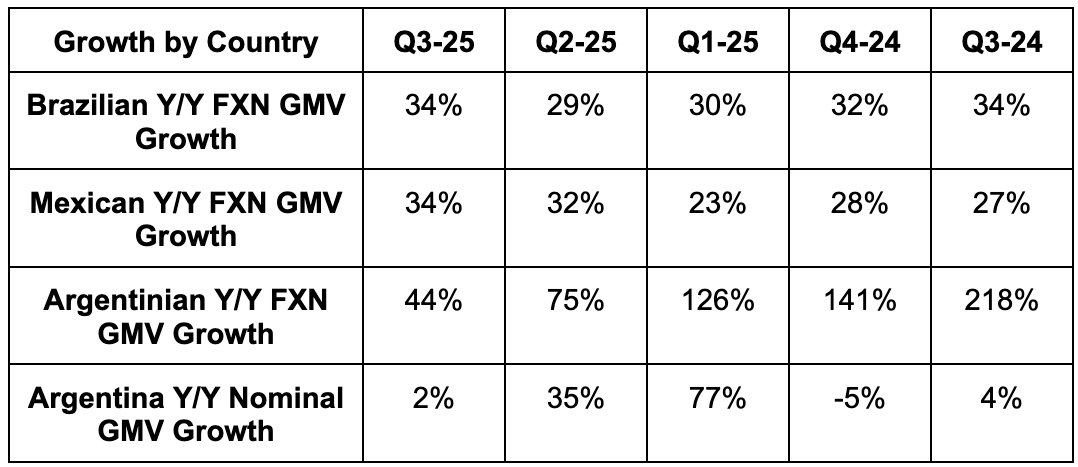 - 44% FXN GMV growth in Argentina missed 65% growth estimates. Slower inflation weighed on nominal growth and was a source of slower FXN growth. Real growth (ex-inflation) remained strong.