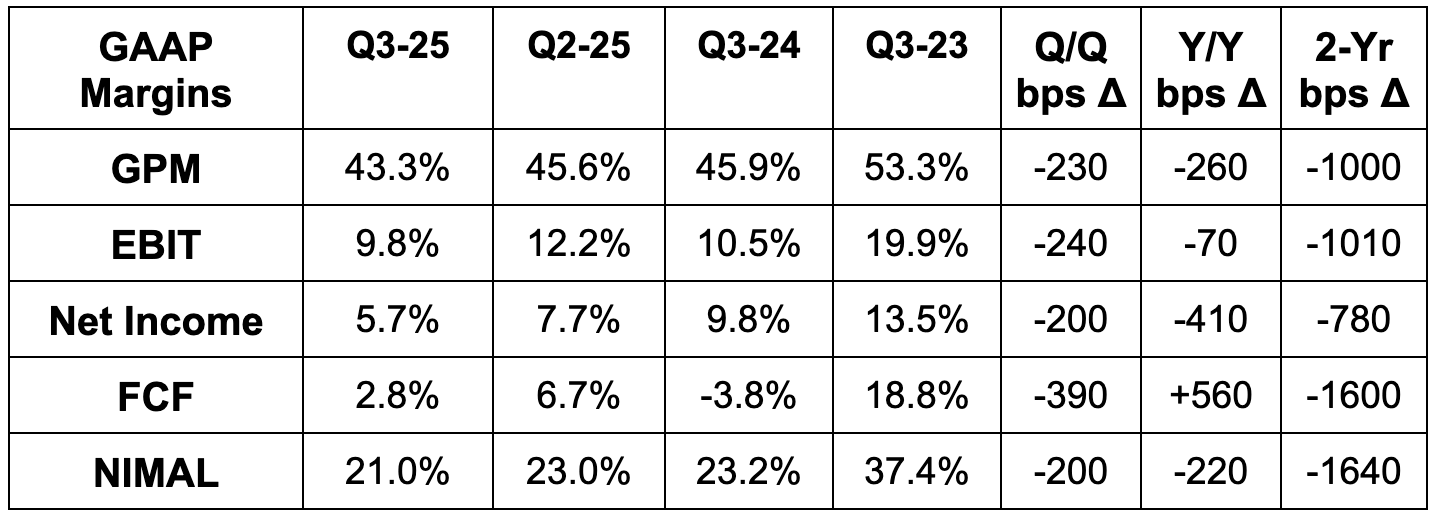 - Missed 45% GPM estimates by 170 basis points (bps; 1 basis point = 0.01%).