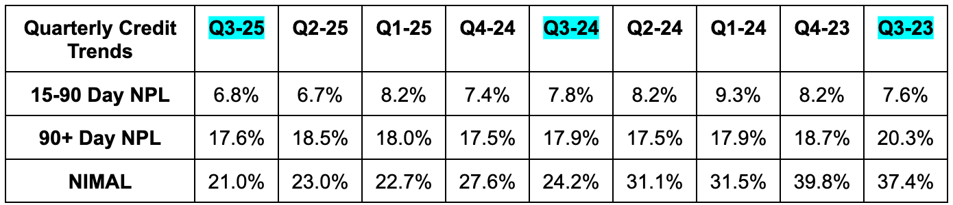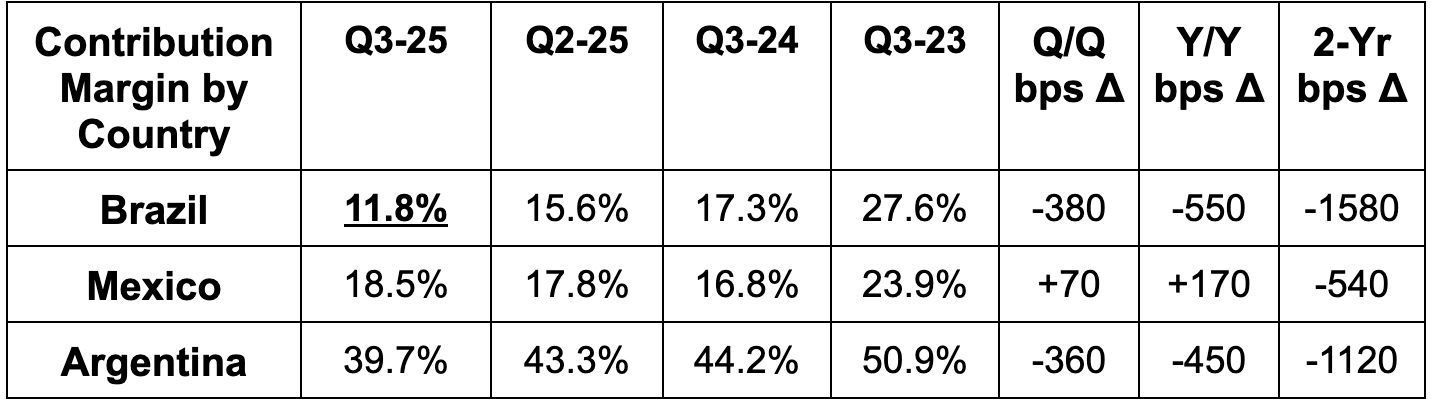 For Argentinian contribution margin, macro pressures led to rising funding costs and a 450 bps Y/Y headwind for that metric. It would have been flat without this factor. For net interest margin after losses (NIMAL), the note on higher Argentinian funding costs led to that decline and miss. Credit quality is stable or improving.