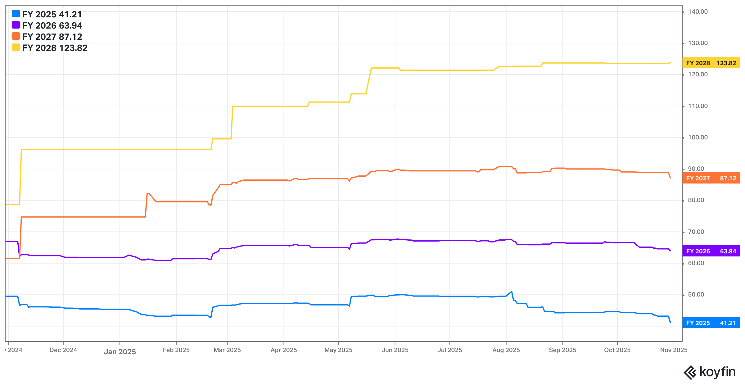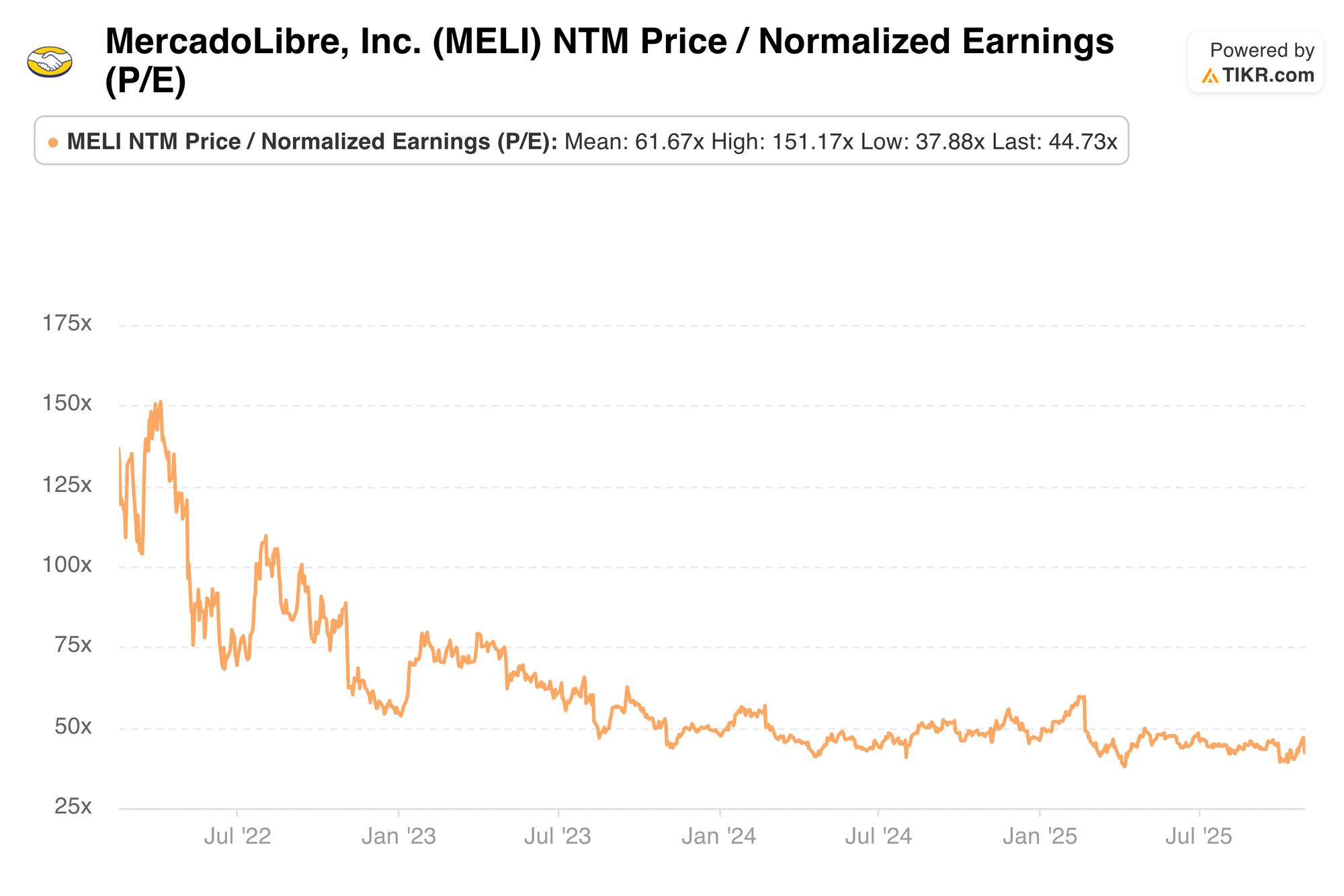 MELI trades for 45x forward EPS. EPS is expected to compound at a 46% clip in 2026 and 2027 after just 9% growth this year.