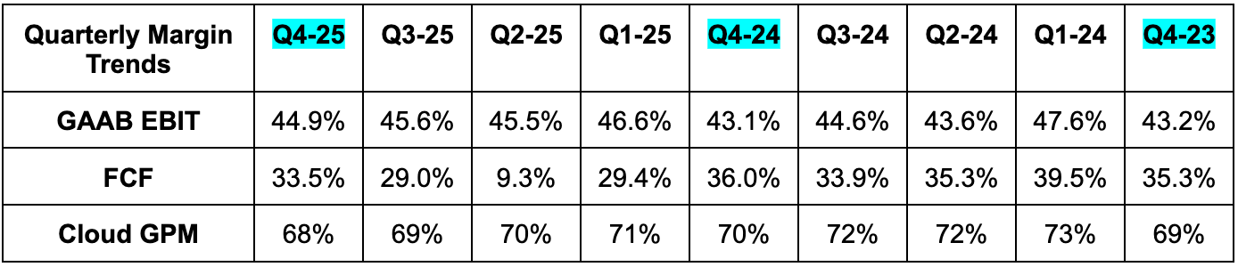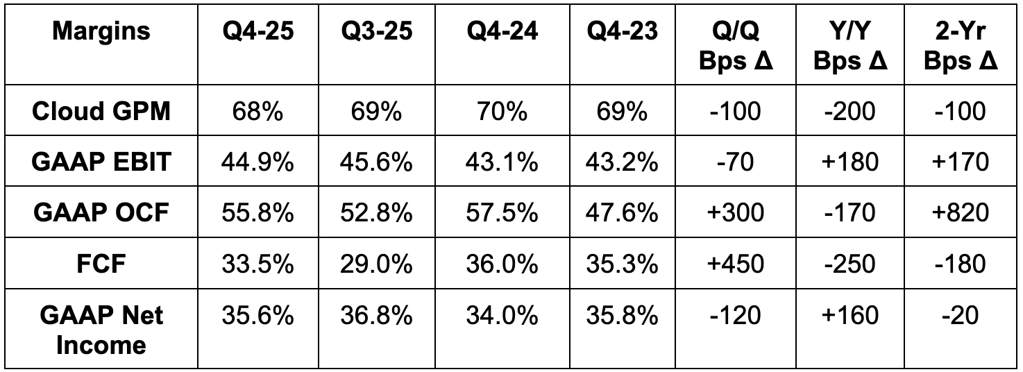 - Q1 cloud GPM is expected to fall to 67% due to more infrastructure spending.