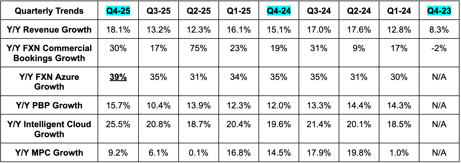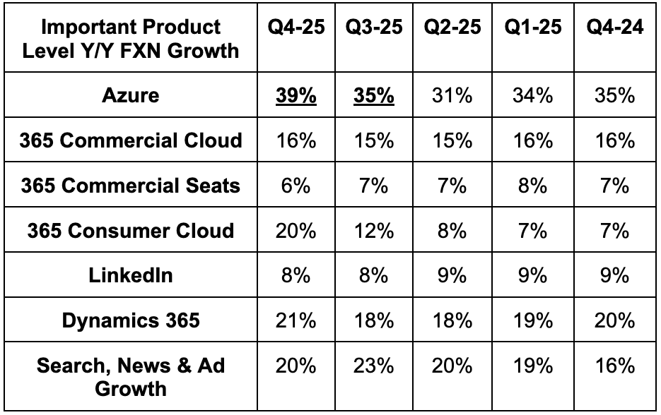 - Beat 34.5% foreign exchange neutral (FXN) Azure growth estimates & guidance by 4.5 points each.