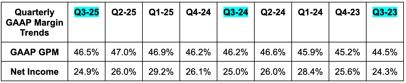 - Beat 46% GPM estimates & beat 46% guidance by 50 basis points (bps; 1 basis point = 0.01%) each.