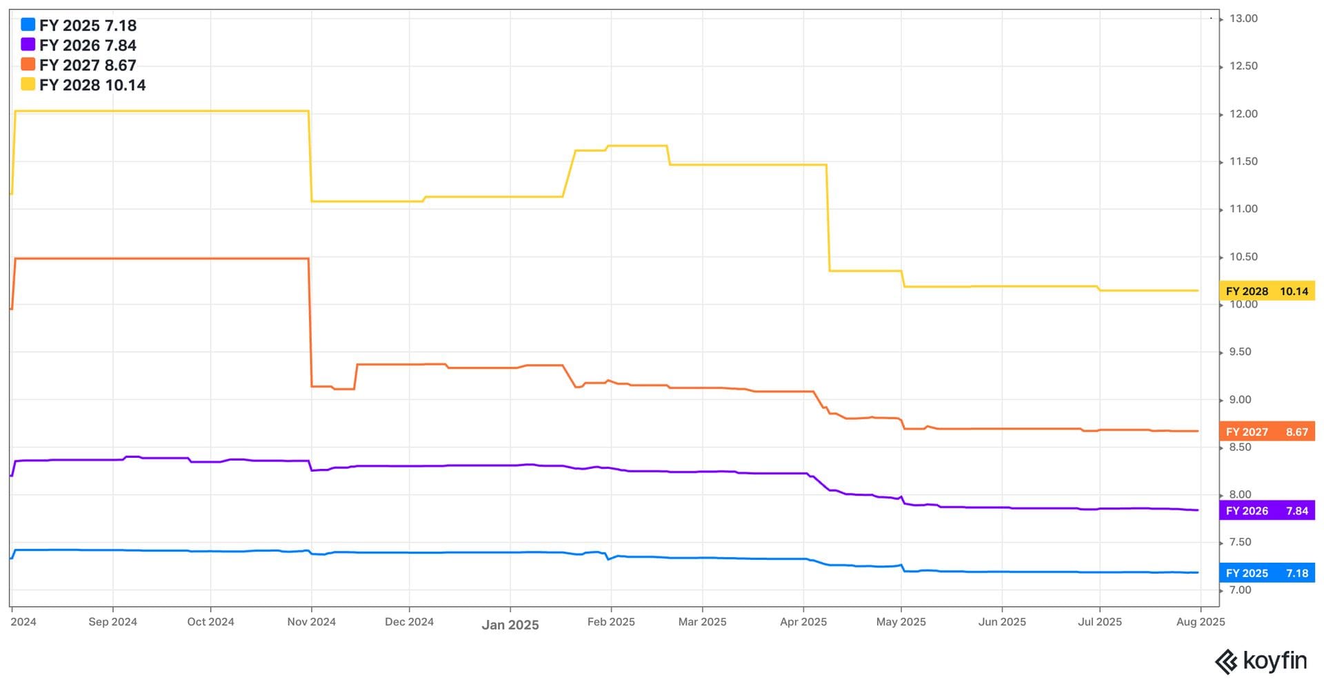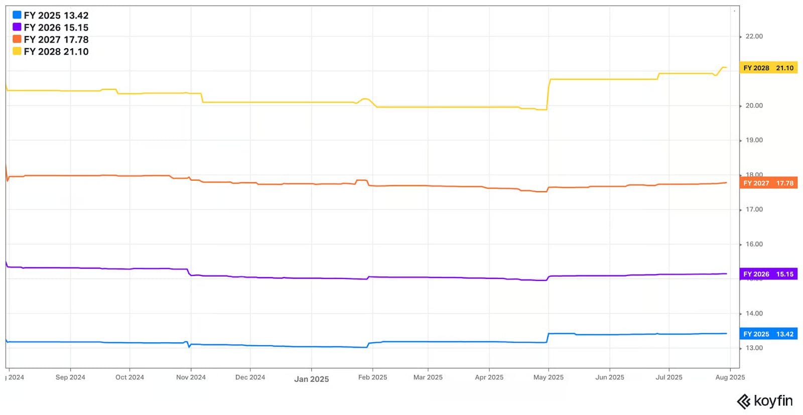 For the full year, they expect 10%+ revenue and EBIT growth, as well as stable Y/Y operating margins. This led to revenue and EBIT estimates for next year modestly rising.