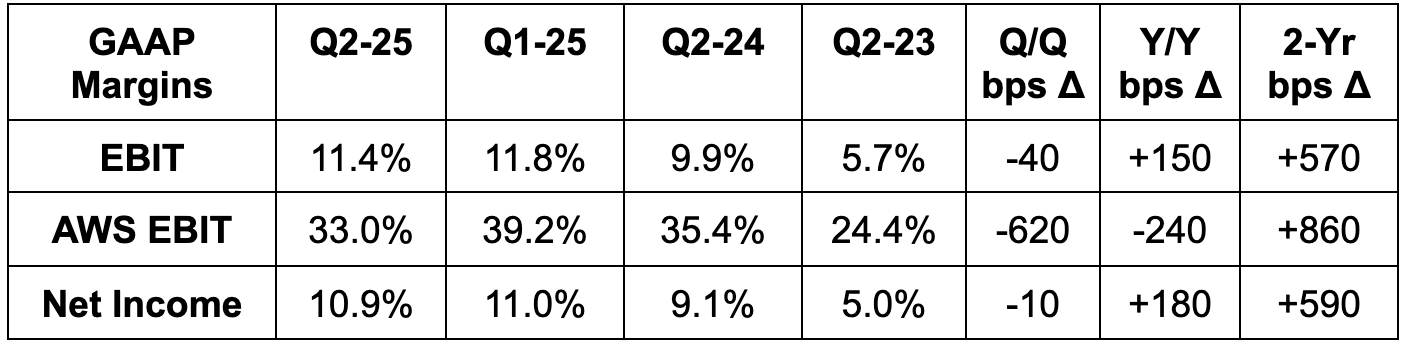 - AWS EBIT margin declines Q/Q as expected. This is highly influenced by timing of capacity coming online from quarter to quarter. Furthermore, seasonal increases in stock compensation also led to a Q/Q decline. Without that rise in comp, the margin would have been 36.1%.
