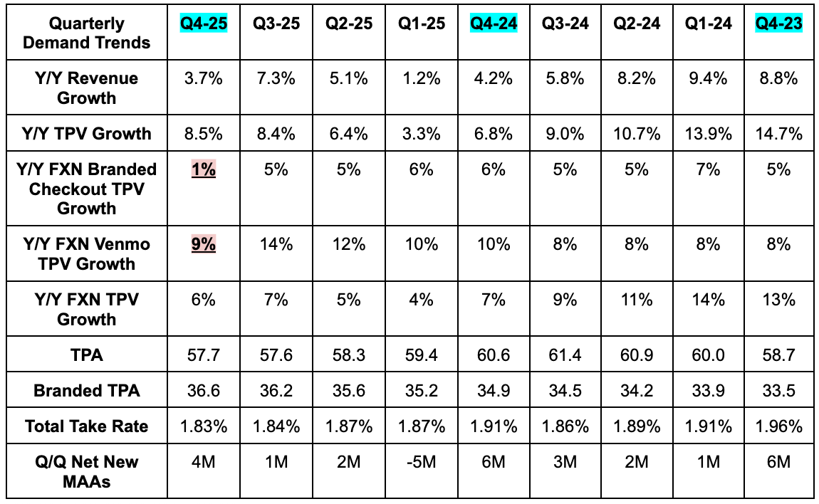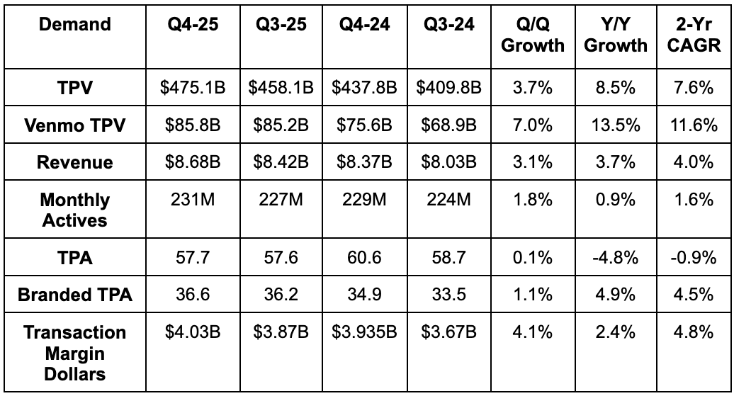 Have to give them credit where credit is due. While their main profit driver is dumpster fire, they are killing it elsewhere. Venmo grew revenue by 20% in 2025 and delivered 5 straight quarters of TPV growth. This was driven by a healthy blend of double-digit revenue per user growth and solid 7% Y/Y monthly active user (MAU) growth despite its large base of 67M. “Pay with Venmo” volume rose by 30%+ once more and engagement trends remained strong.
