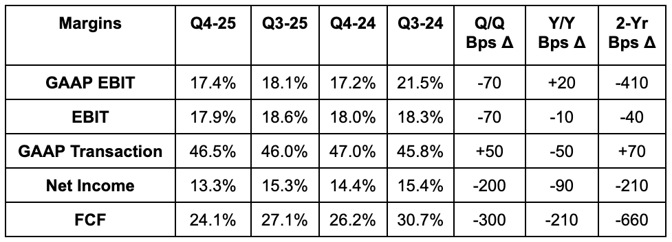 PayPal expects a slight decline in transaction margin dollars for 2026 as a whole, which already missed 3% growth estimates. The weakness stems from expectations that branded checkout will not materially grow in 2026. More market share losses, which is obviously bad. As I’ve talked about during the quarter, leadership warned us that bigger investments were coming many times. They pointed to those investments coming because customers weren’t reacting to new products as expected. And when the investments come alongside bad demand trends, transaction margin and other profit metrics look this bad. 2026 is therefore going to be their third “transition year” in a row. That’s a lot of transitioning, with 3% Y/Y OpEx growth paired with negative demand trends being the result. The investments needed to try more repairs will lower TM$ growth by 3 points for 2026. Finally for 2026, it sees $6B+ in FCF, which missed $6.5B estimates by 8% at most.