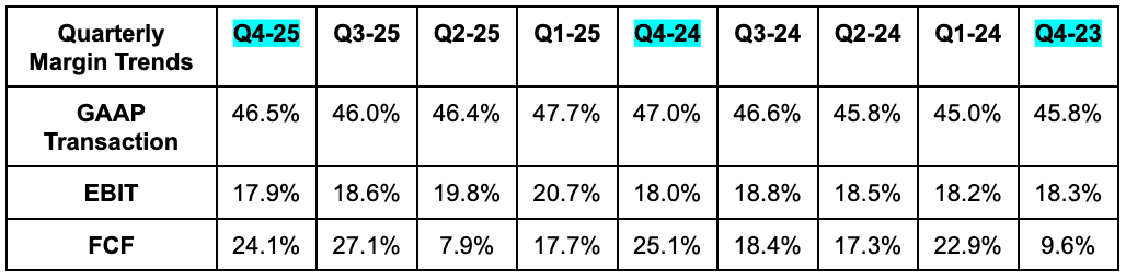 - Missed transaction margin dollar (TM$) estimate by 1%. 3.5% Y/Y TM$ growth also missed its 2.5% Y/Y growth guidance.