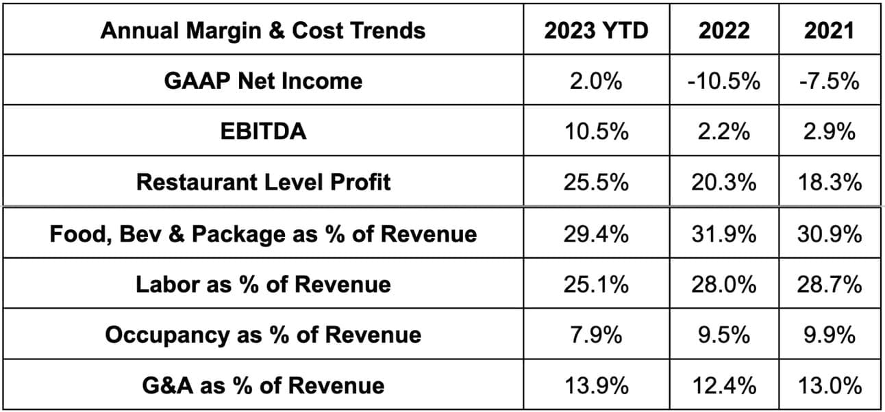 Cava prides itself on a workplace culture that prioritizes internal promotion and strong compensation/benefits. It invests ahead of the curve in wages to maximize worker retention and minimize disruption and training costs. For example, it hiked starting wages to $13 an hour all the way back in 2016. This was well beyond legal requirements at the time. While this means tougher margin maintenance, its proactive approach to wage increases meant that it didn’t need to play catch-up last year. That lack of pressure freed it to hike menu prices by under 5% despite rampant inflation. Looking ahead to 2024, Cava just made another large investment in wages to “ensure it’s highly competitive in all markets.” Labor as a percentage of revenue should be up 100-120 bps Y/Y as a direct result.