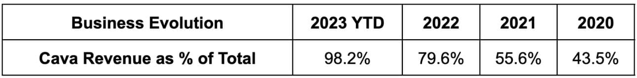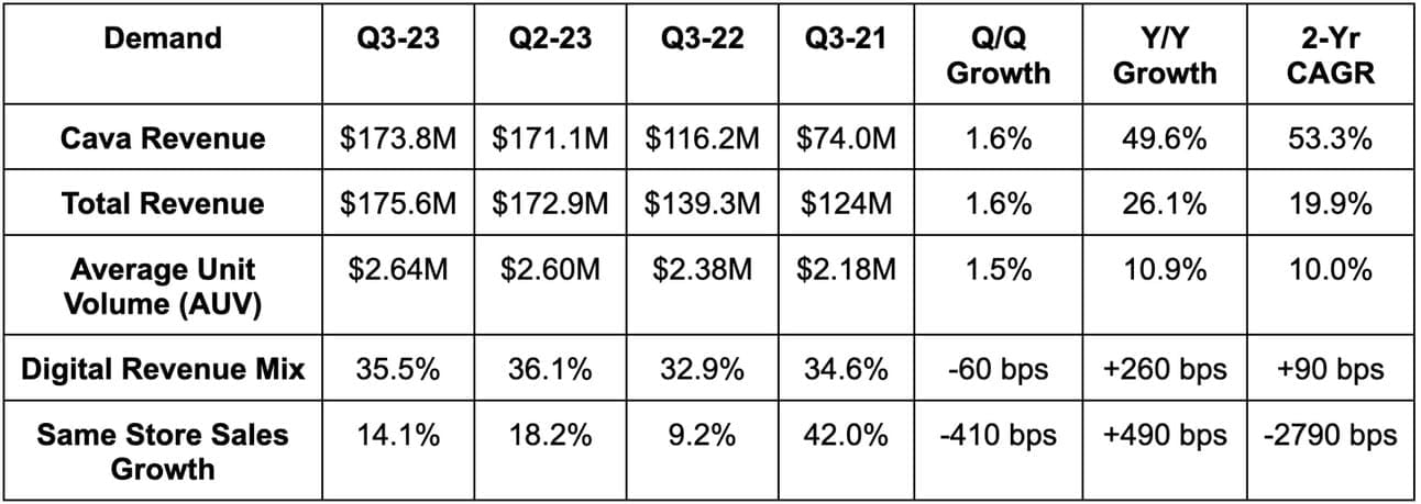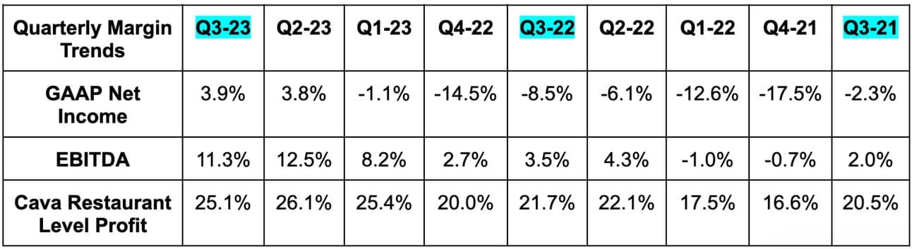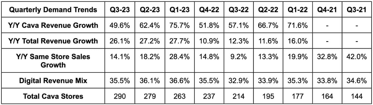 The Zoe’s overhaul mainly took place in 2021 and 2022. This makes total revenue growth a bit noisy as it involves cannibalizing old Zoe’s revenue. For this reason, it’s best to focus on Cava revenue. With conversions now complete, Cava and total revenue will fully converge.