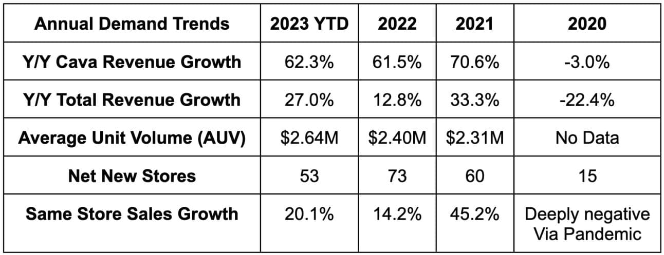 Cava has quickly established a compelling trend of under-promise and over-deliver during its short public history. Whether it’s new store openings, same-store sales growth, EBITDA or revenue overall, results continue to outperform. The team has consistently built some extra prudence into its guidance.