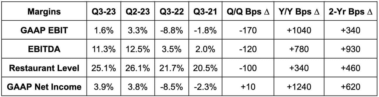 - Now a 24%+ restaurant-level margin vs. 23%+ previously.