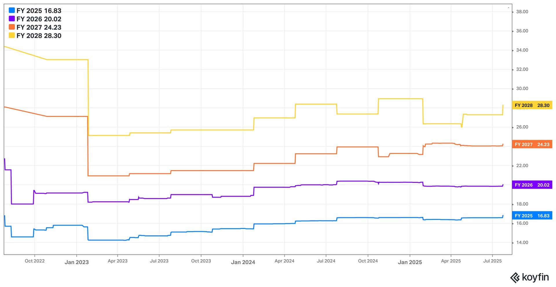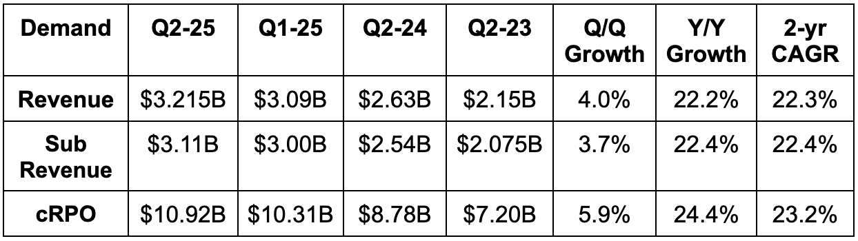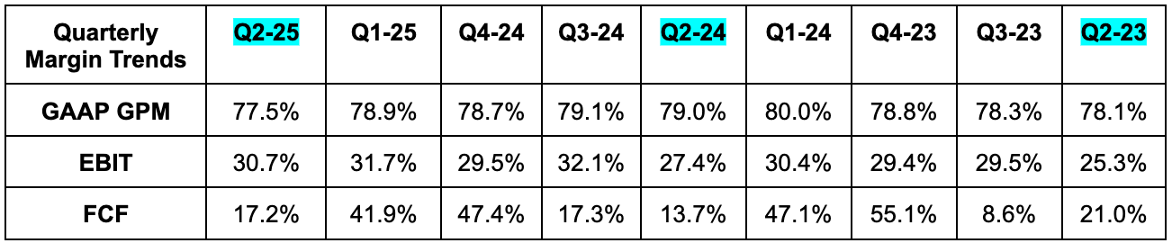 For Q3, subscription revenue guidance beat estimates by 1.5%. Total revenue estimates for the quarter haven’t yet moved, considering the best was modest. Q3 30.5% EBIT margin guidance missed 31.5% margin estimates; EBIT dollar estimates fell by 5% following the call as a result of this. It also guided to 18% Y/Y FXN cRPO growth for Q3.