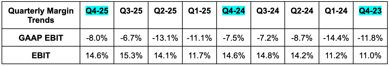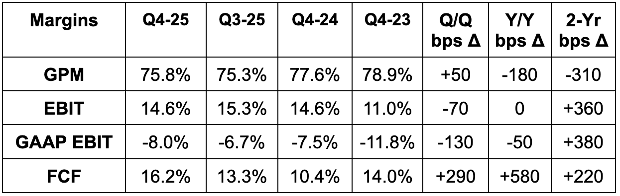 The same harmless trend impacting GPM in recent quarters hit that margin during Q4. Paid traffic increased as a percentage of total traffic, which means more overall expenses allocated in cost of goods sold rather than sales and marketing. There is no material impact on EBIT or net income, as it’s just reshuffling where expenses are realized.