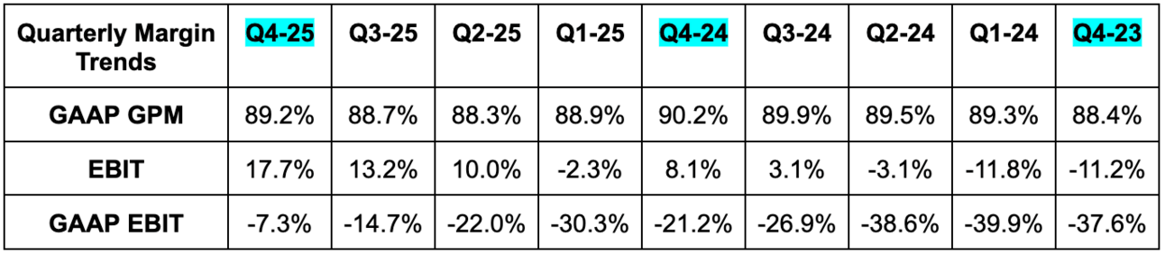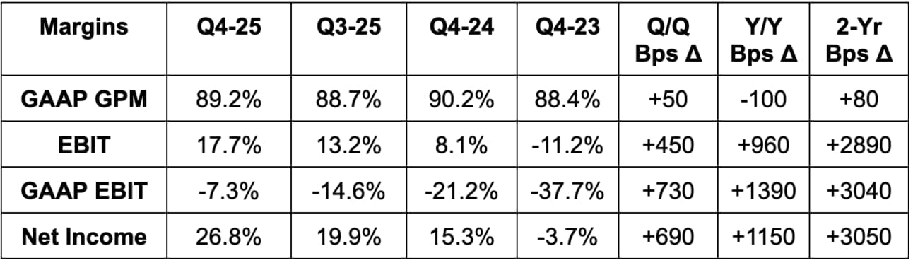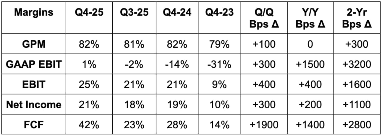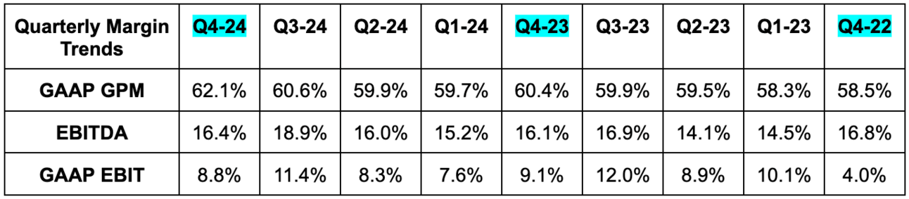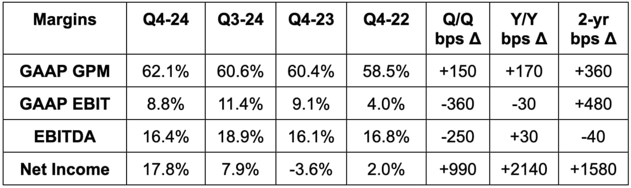 - Beat 61.6% GAAP GPM estimates by 50 bps & beat guidance by about 50 bps.