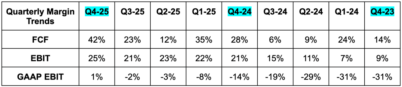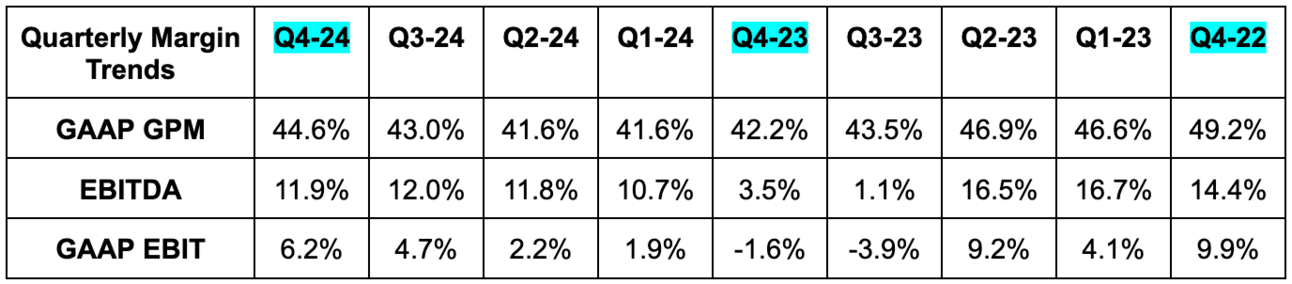 - Beat 16.3% annual EBITDA margin guidance with a 16.7% EBITDA margin for the year. This also beat 16.4% margin estimates.