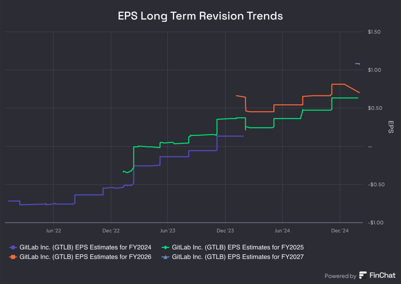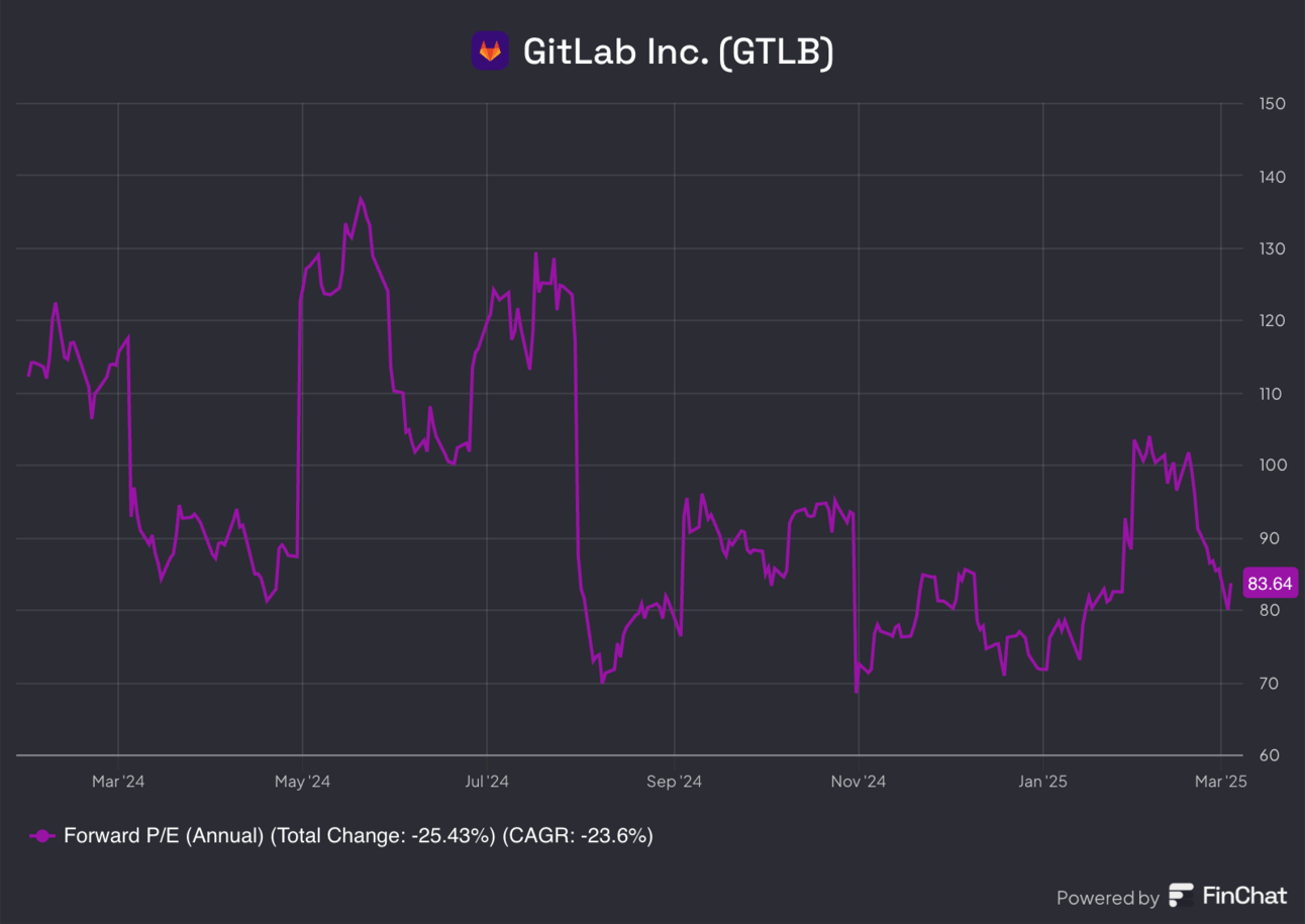 Gitlab trades for 83x forward EPS guidance. EPS is expected to fall this year due to large tax rate change headwinds before rising by 54% the year after.